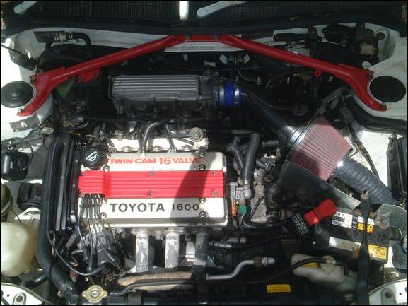At the moment its the standard 4AGE 100kw 16v twin cam motor and will be reborn with the 4AGE 20v blacktop 6spd half cut with an HKS Turbo kit |
