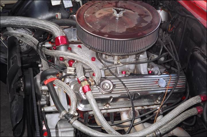 454 Big Block Chev on straight gas. Mild Crane cam, roller rockers, pocket ported oval port heads. Edelbrock dual plan medium rise manifold, Pacemaker extractors, recurved Chev HEI with Accel high discharge coil,Eagle 9mm spiral core leads. |