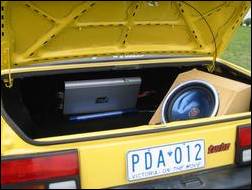 Pioneer DEH-2450 CD Headunit, Alpine Type S 6 1/2 inch 2 way splits (front), Alpine Type R 6 1/2 inch 2 way (rear), Clarion V-NET 4150 amp (4x150 watts RMS @ 4ohms), Kenwood Tornado Sub 800watts (400RMS). |
