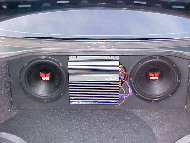 Panasonic mp3/cd deck, monster power cable, Alpine VR3 amps, 3 Rockford Fosgate 10" punch 450w each in closed box, custom to take minimal trunk space |