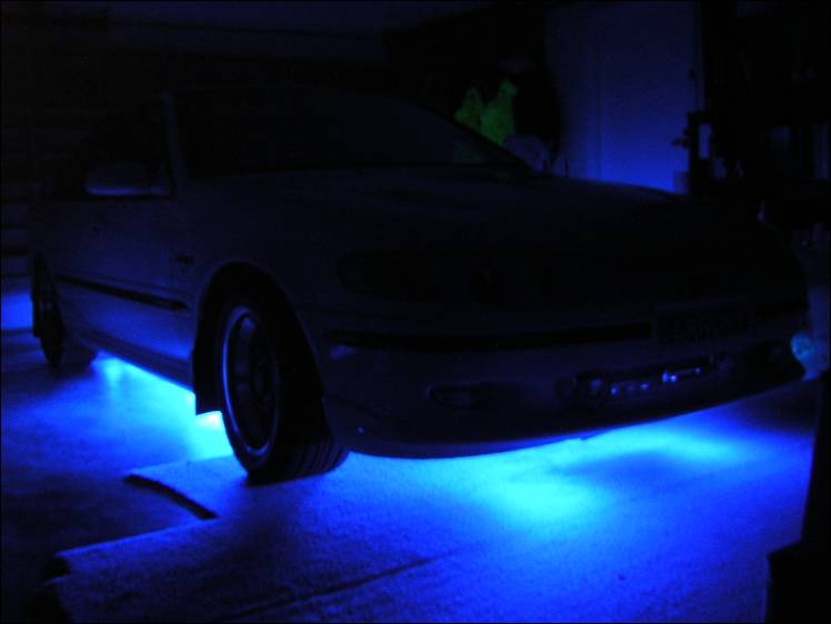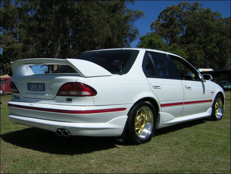 Full EL Tickford bodykit, EL GT rear wing, and EL XR front headlight mouldings. 55 watt driving lights. Blue under car neons wired up to the interior lights, which looks awesome when you open the doors or unlock the car. Uhf/scanner aerial for Uniden UH-013. Bonnet protector. Custom blue number plates 'GRRUNT'. |