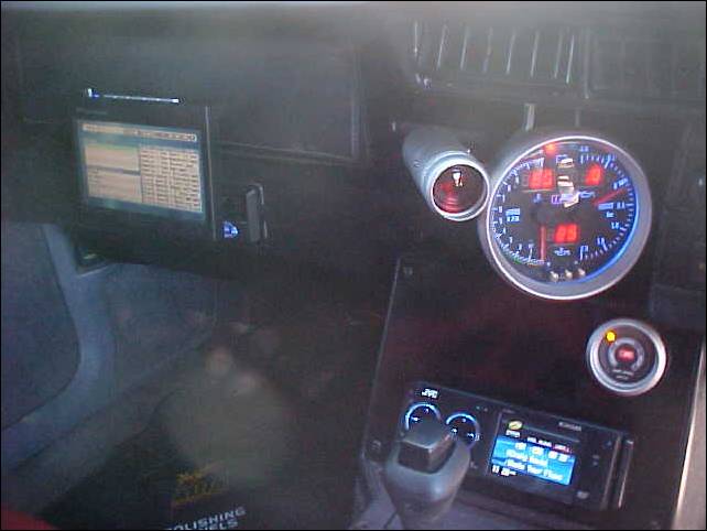 Striped rear. R1 racing seats and OMP 4-point harnesses. Autogauge gauges (tach, temps, boost, A/F ratio, oil pres, voltage) |