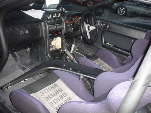 Driver/Passenger BRIDE seats, Blitz Dual SBC, weight reduction, Full Roll cage, RAZO knob, OMORI oil, oil temp, water, and boost gauges. |